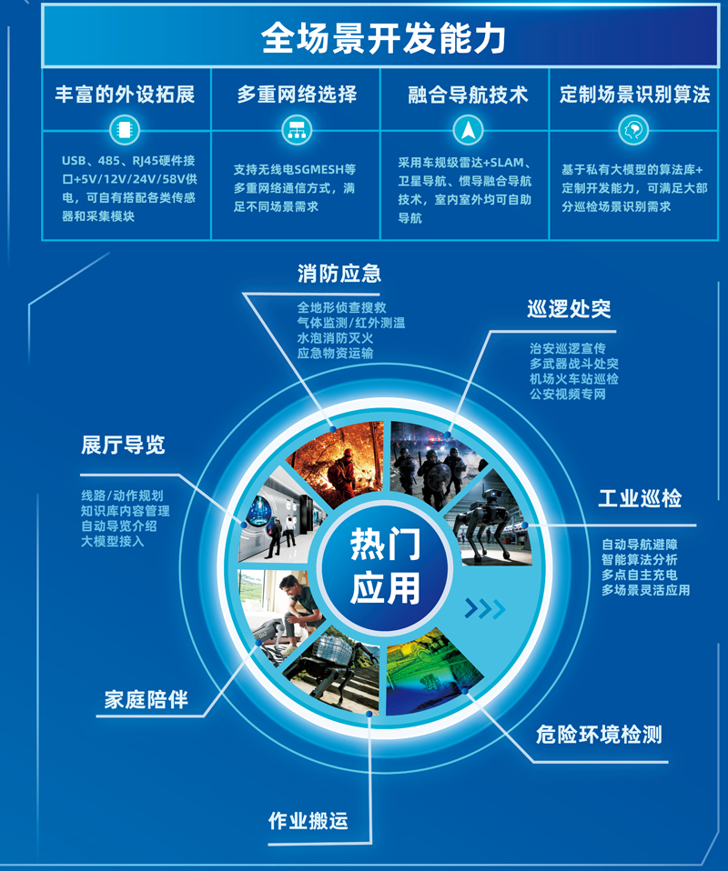 廣泛應(yīng)用與城市消防救援、山岳救援、地震及地質(zhì)災(zāi)害救援、化工廠巡檢及消防救援、公安安全、邊境邊防巡邏、家庭陪伴等