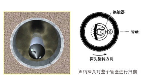 聲納探頭具有一個(gè)可旋轉(zhuǎn)的超聲換能器,換能器投射聲波到管道壁,并接收回波。換能器在1秒內(nèi)完成360度連續(xù)掃描,每一個(gè)360度都會(huì)有400個(gè)發(fā)射/接收的周期,波束角度為0.9度,每一個(gè)發(fā)射/接收周期采樣250點(diǎn)。