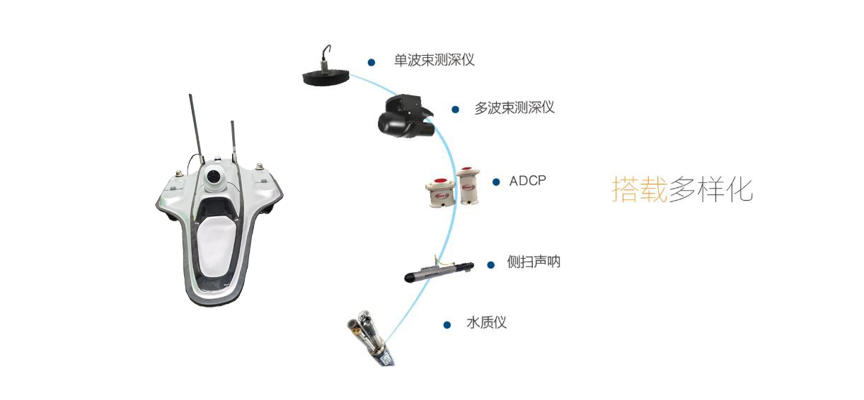 可根據(jù)需要靈活搭載GNSS接收機(jī)、測(cè)深儀(單波束/多波束)、側(cè)掃聲吶、ADCP、多參數(shù)水質(zhì)監(jiān)測(cè)儀、監(jiān)控警報(bào)等多種傳感器設(shè)備,可執(zhí)行大范圍水域的水文測(cè)量、水下地形/地貌測(cè)量、流速流量監(jiān)測(cè)、無(wú)人巡邏及水質(zhì)在線監(jiān)測(cè)等多種功能。